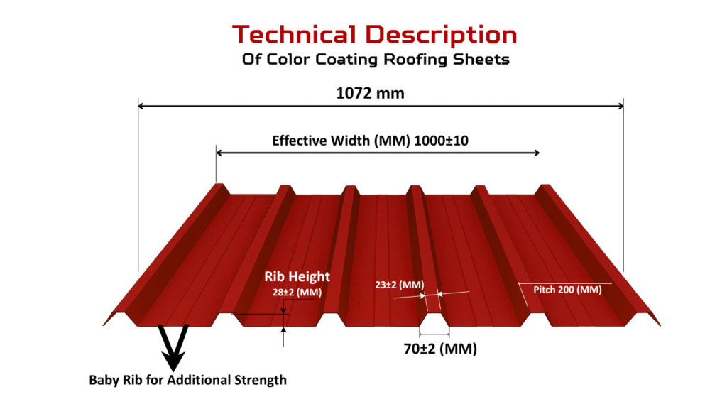Our Color Coated Roofing Sheets are designed for strength, durability, and long-lasting performance. With an effective width of 1000±10 mm, 28±2 mm rib height, and additional baby ribs, these sheets provide better load strength, excellent coverage, and reliable weather protection.